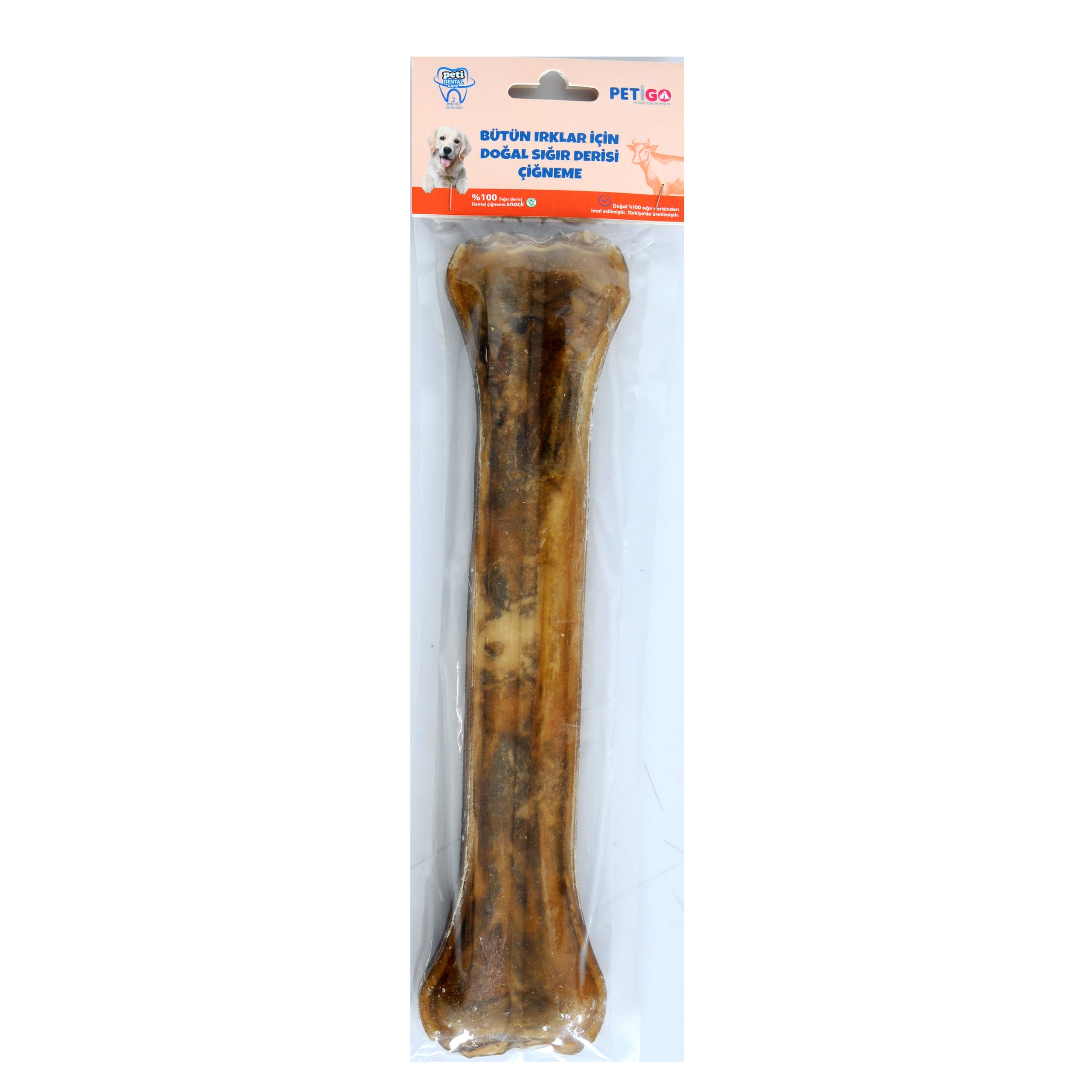 Koruyucu veya beyazlatıcı işlem görmemiş %100 doğal sığır derisinden üretilmiş büyük boy köpek çiğneme kemiği. Büyük ırklar için doğal lezzet ve dayanıklılık sunar.
